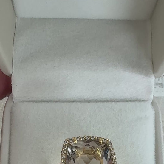 Su piedra central es un Smoky Quartz de corte cushion de 12 mm (5,6 cts), acompañado de 32 topacios blancos redondos de 1,0 mm, que añaden destellos luminosos que resaltan el color profundo de la piedra principal.