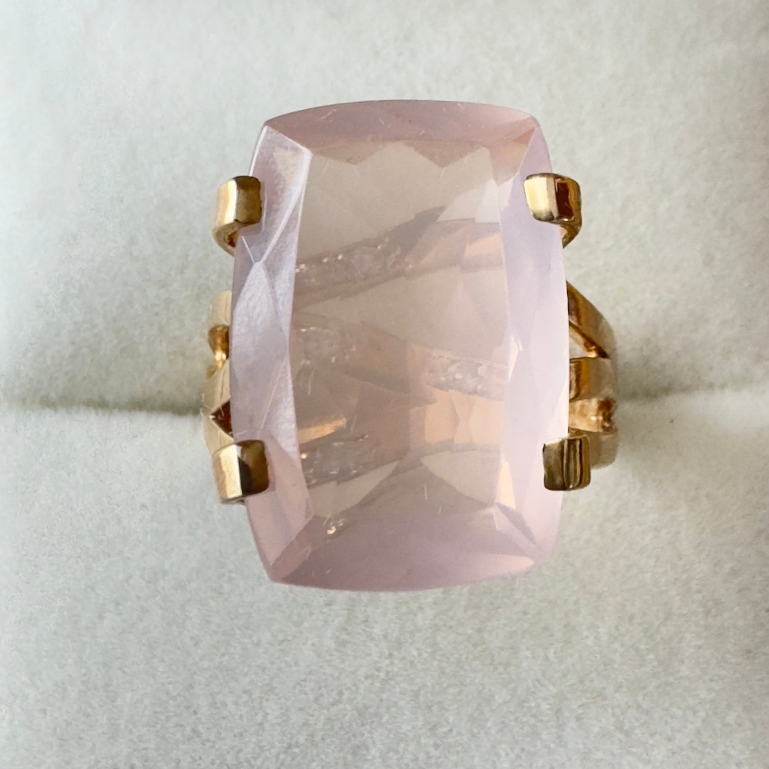 Anillo en vermeil oro 18k con una delicada Rose Quartz de corte antiguo. Una joya suave, elegante y luminosa con un diseño geométrico moderno.
