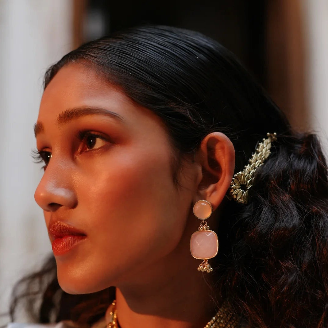 Diseñados para realzar el rostro con un toque de lujo sutil, estos aros combinan piedras naturales de cuarzo con acabado dorado, creando una joya equilibrada entre diseño contemporáneo y trabajo artesanal.